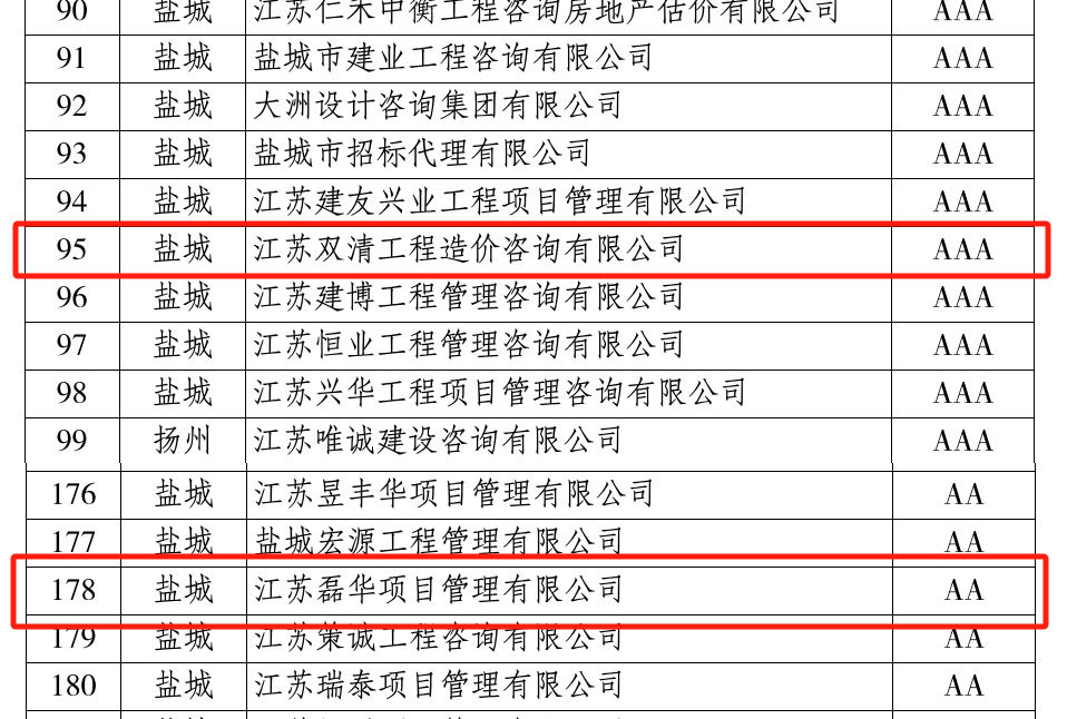 江蘇磊華項(xiàng)目管理有限公司獲得省AA級(jí)招標(biāo)代理信用評(píng)價(jià)、江蘇雙清工程造價(jià)咨詢有限公司獲得省AAA級(jí)招標(biāo)代理信用評(píng)價(jià)